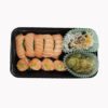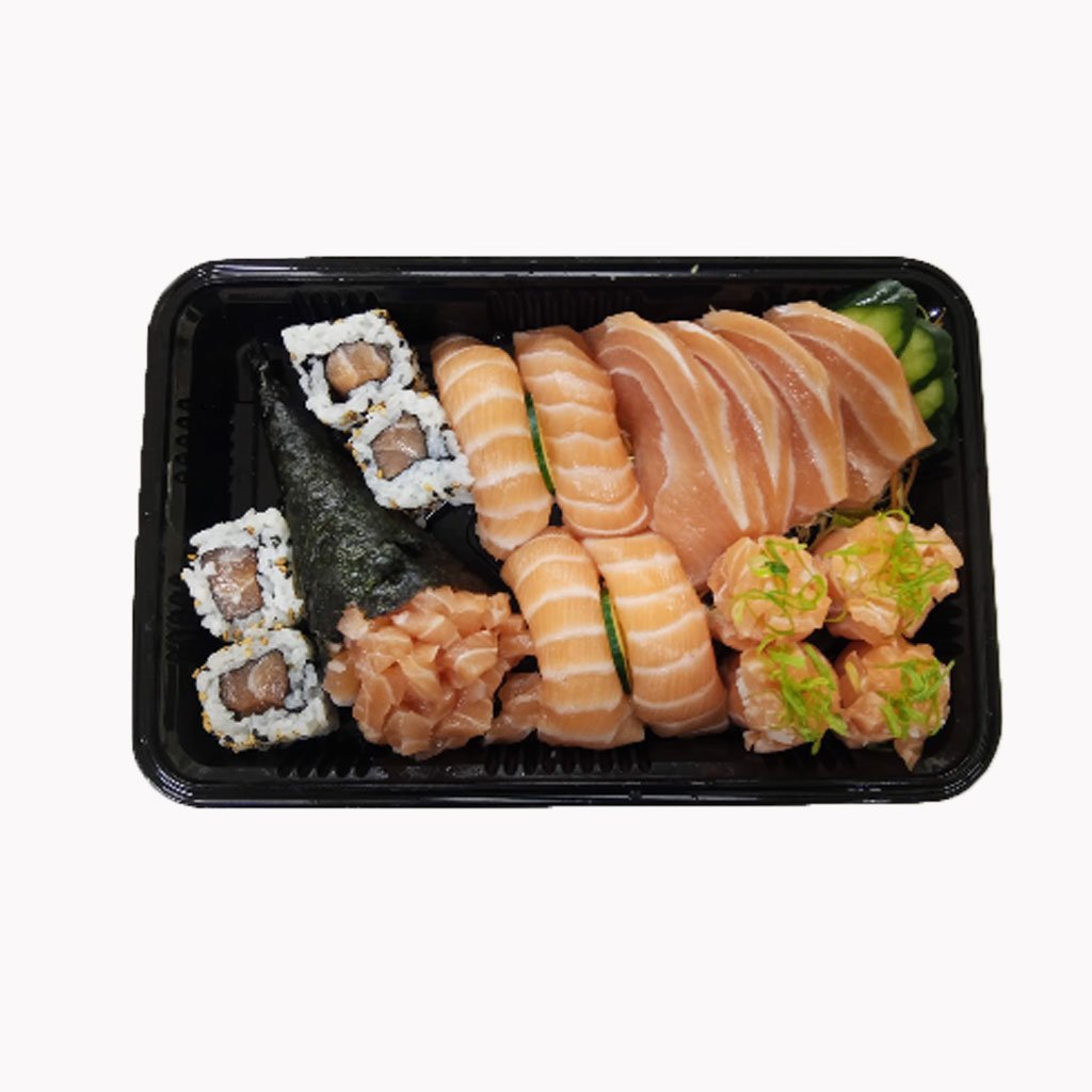 Combinado de salmão: 1-mini temaki, 4 sashimis, 4 uramakis , 4 joys e 4 niguiri de salmão.