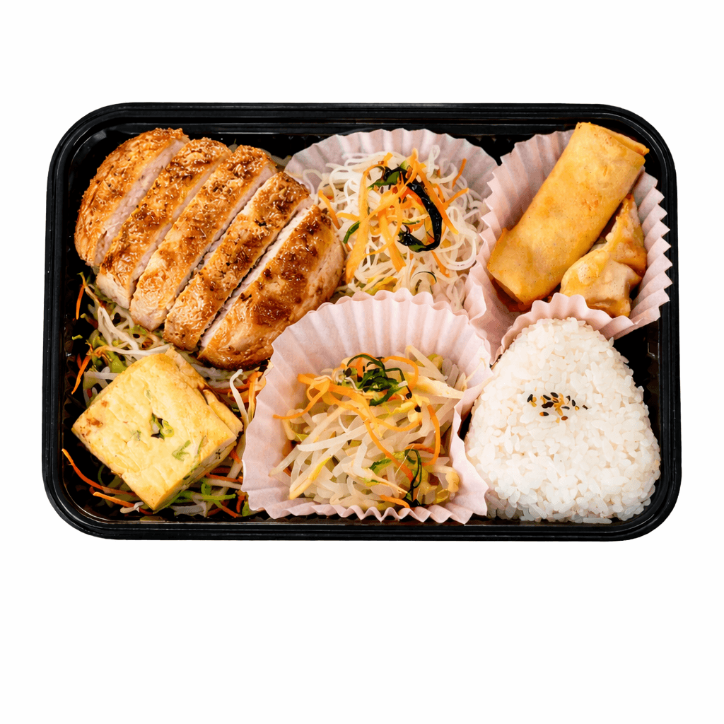 Peito de frango grelhado, suculento e levemente temperado ao estilo oriental, acompanhado de onigiri tradicional, tamagoyaki, guioza frito e harumaki de queijo. Escolha 2 acompanhamentos para completar sua refeição.