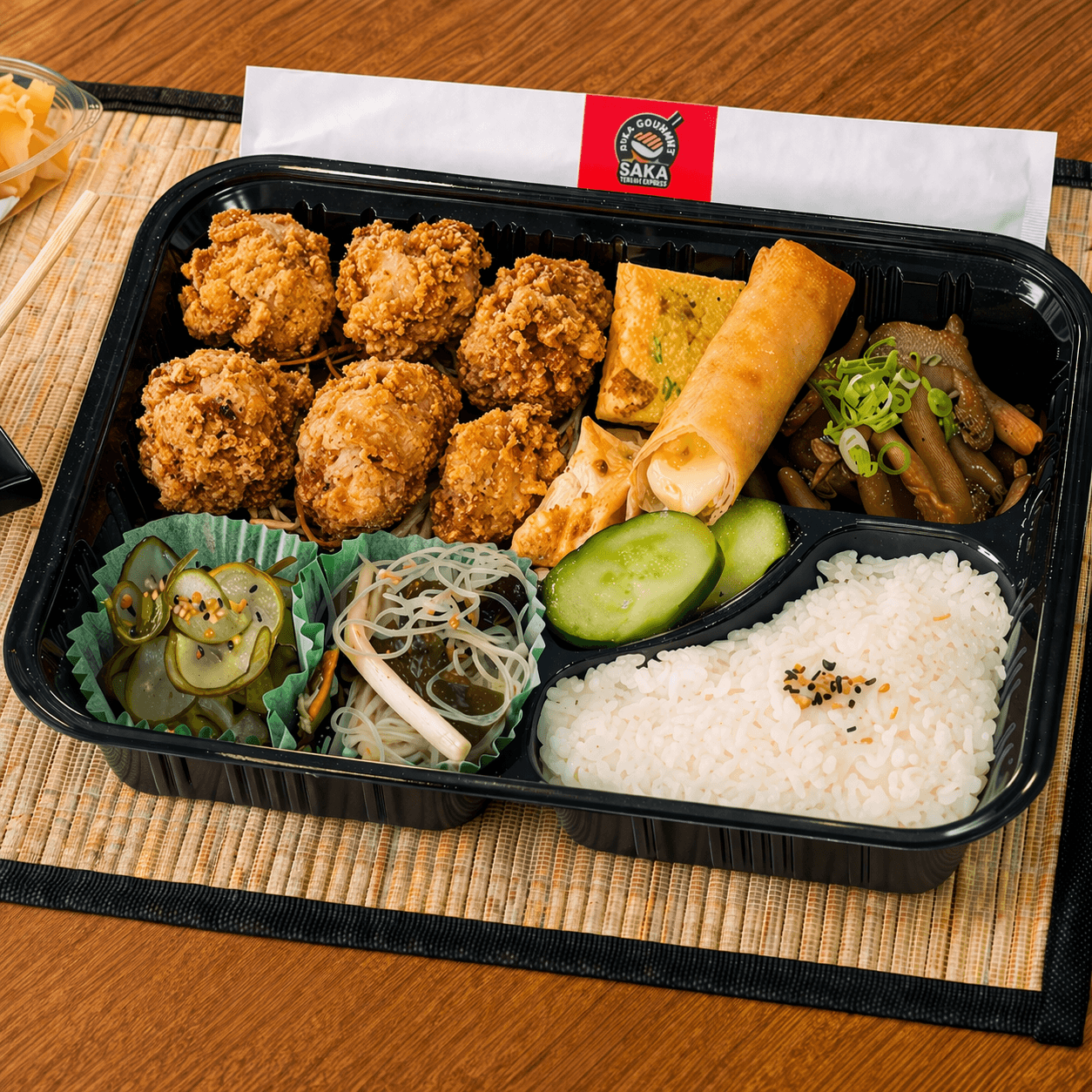 Karaage de frango, com pedaços marinados e fritos ao estilo japonês, crocante por fora e suculento por dentro, acompanhado de tamagoyaki, guioza frito, harumaki de queijo, shimeji na manteiga e arroz oriental. Escolha 2 acompanhamentos para completar seu bentô.