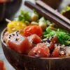 Cubos de atum fresco servidos sobre arroz oriental temperado, acompanhados de cream cheese, sunomono, pedaços de tomate e cebolinha. Um poke leve, saboroso e fresco, ideal para quem aprecia a textura delicada e o sabor marcante do atum.