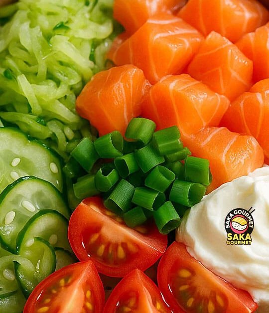 Salmão fresco cortado em cubos, servido sobre arroz oriental temperado com delicados temperos japoneses, acompanhado de cream cheese, sunomono, pedaços de tomate e cebolinha. Um prato leve, fresco e cheio de sabor, perfeito para uma refeição equilibrada e deliciosa.