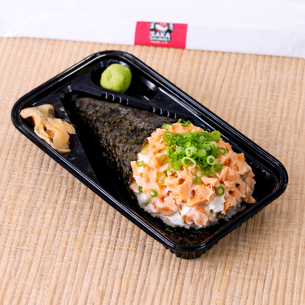 Cone de alga crocante recheado com arroz, salmão grelhado, cream cheese e cebolinha, preparado para quem gosta de um sabor mais intenso e marcante.